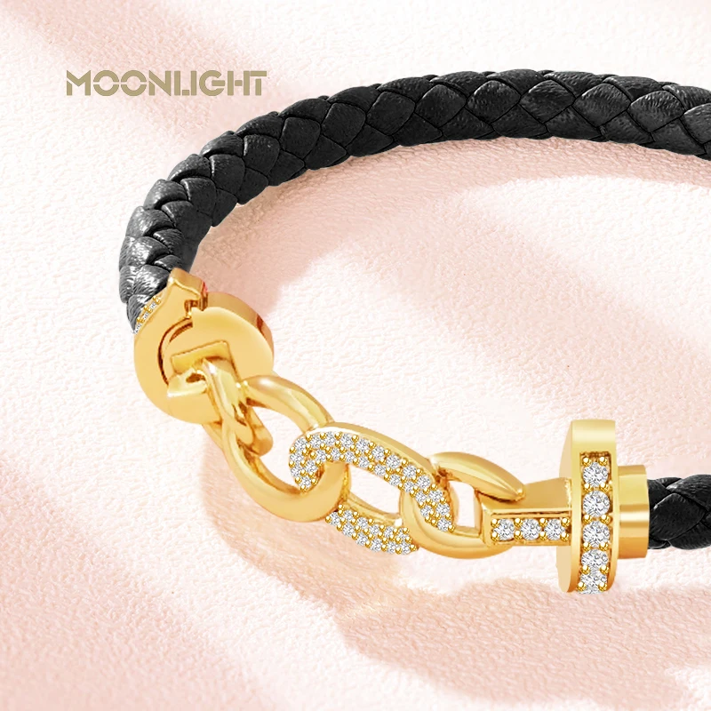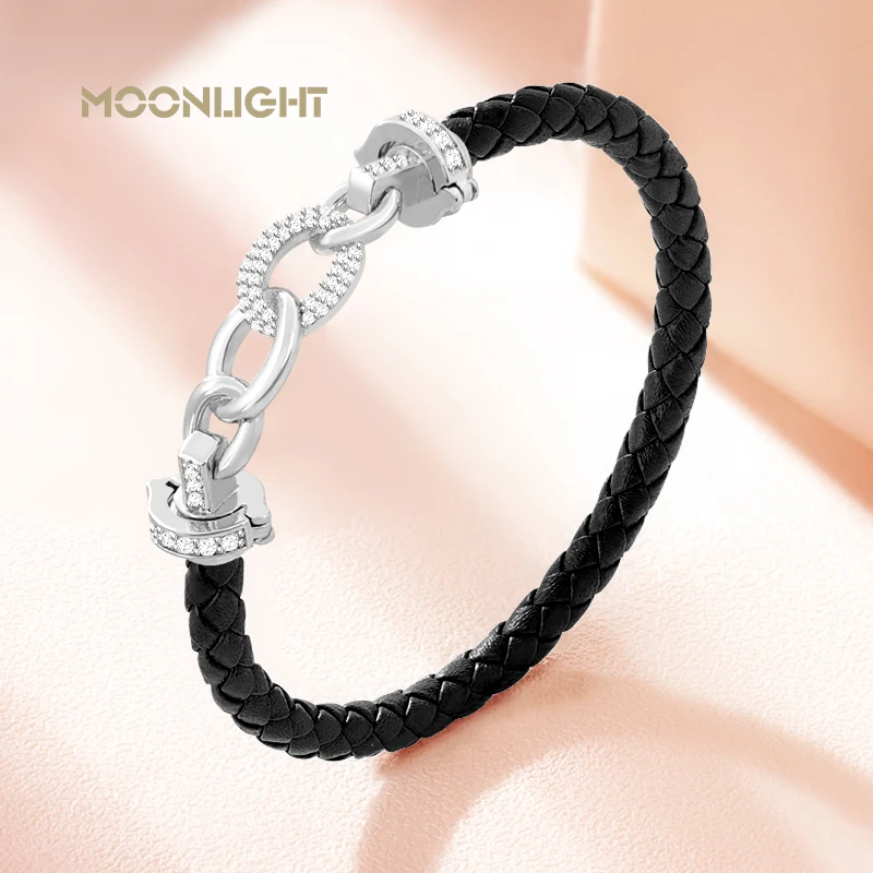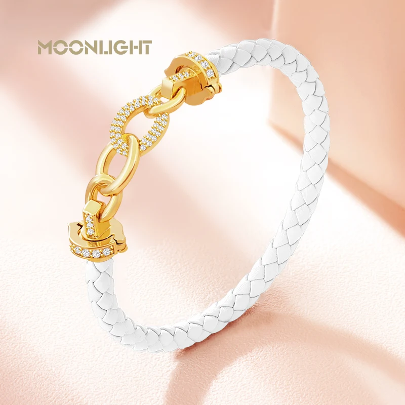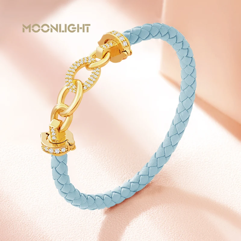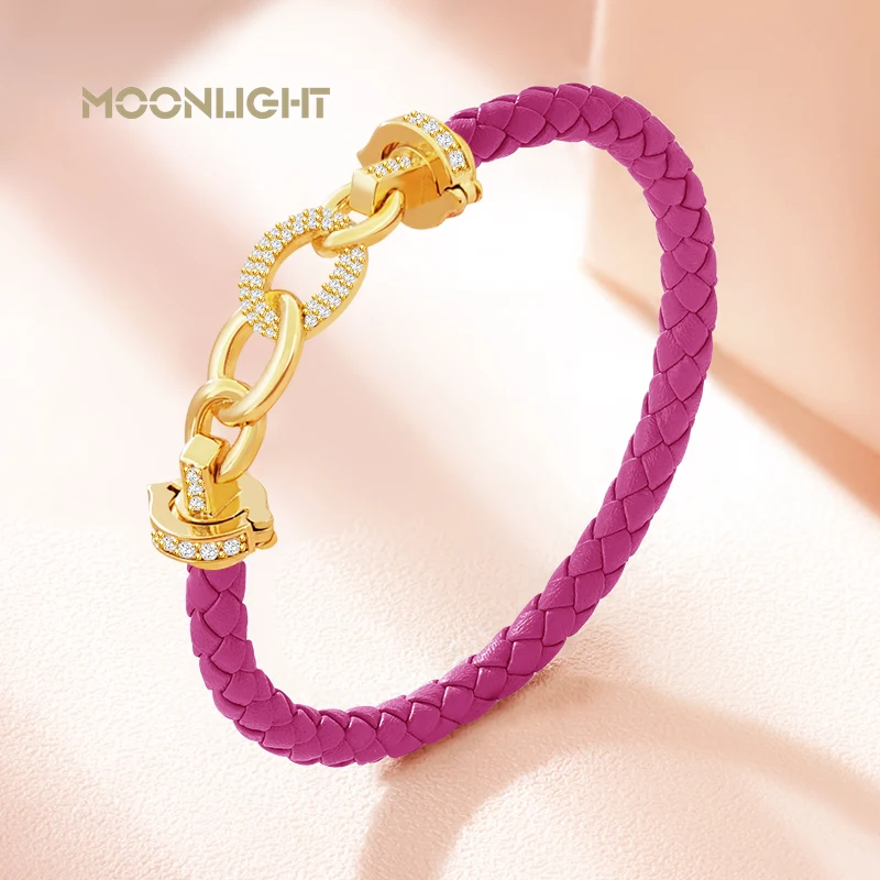 اشكال البريسلت MOONLIGHT الفاخر المميز بتصميمه العصري والجذاب، حيث يجمع بين الجلد الطبيعي المضفر والزركون اللامع. هذا السوار يتمتع بمظهر أنيق يتناسب مع مختلف الإطلالات. يتميز بلون معدني نحاسي مع حبل مصنوع من الجلد الطبيعي المتين، مما يضيف له طابعًا فخمًا ومميزًا. متوفر بـ 13 لونًا رائعًا لتختاري منها ما يناسب ذوقك.