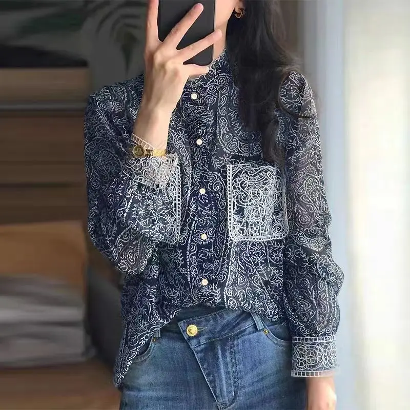 - الاسم: قميص بازرار وياقة قائمة للنساء منقوش
